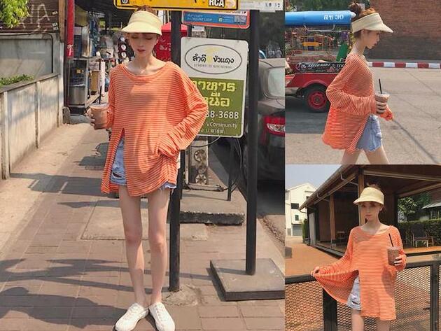 3、这款是珊瑚橙色设计的开叉t恤,对于这种天气来说,外出穿最适合了,既可以当作防晒衫穿,还可以单穿,无论怎么搭都不会出错的一款上衣,条纹设计的元素也可以让你穿出更显瘦的气质,搭配短裤还可以穿出下衣失踪的穿法。
