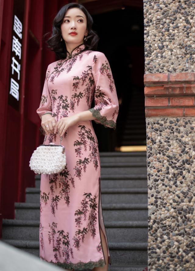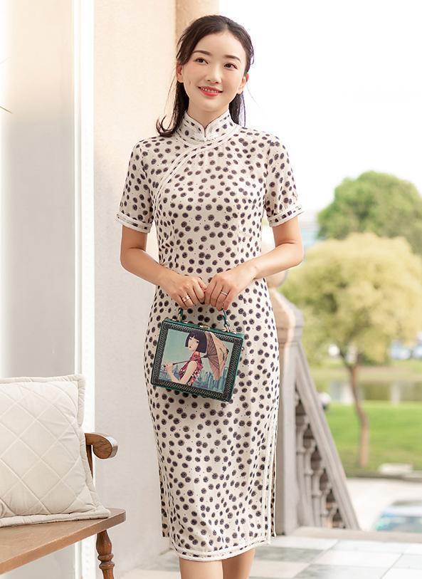 白色的波点清丽雅洁,点点敲击着少女的灵气与活泼,动感十足,白色清新明丽,点染的小花温润了视觉的美好,旗袍线条感柔美流畅,干净利落的表达着知性典雅的东方女人味,旗袍双包边的勾勒,古典婉约,恰到好处的长度,不经意间带出烟视媚行的风姿,如诗般的美丽。