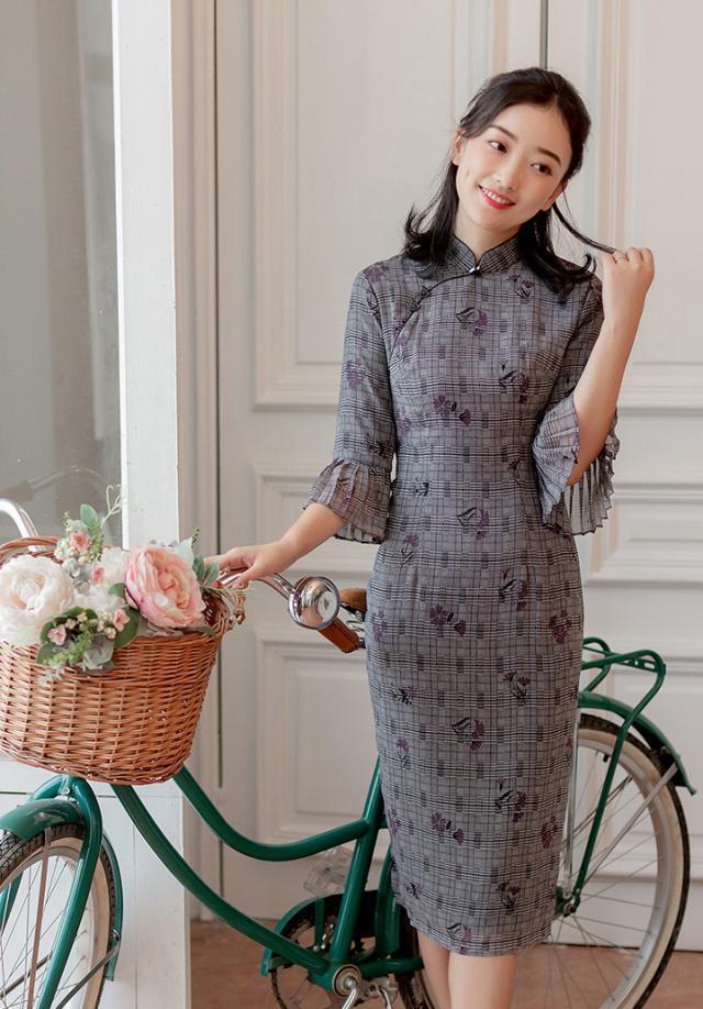 旗袍最能展现东方女子的身材和优雅气质,尤其是当下复古风大肆流行,初秋穿一件旗袍出门,时髦又典雅的知性魅力,灰蓝色的格纹载着复古文艺的气息,静谧温柔,旗袍勾勒出曼妙的身材曲线,立领、盘扣、斜襟,无一不彰显中式典雅的韵味,踩一双高跟鞋,风情婀娜,品味高级。