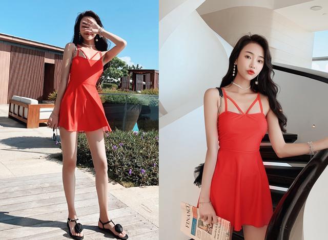 正红色是热情和浪漫的代名词,所以各位小仙女不妨选择一条裙装连体泳衣,胸前设计感吊带设计,凸显女性的性感魅力。收腰和裙摆的设计,不仅能遮住身材缺点,还能呈现S型身材,是所有身材都能驾驭的版型,搭配上正红色,绝对是靓丽风景线。