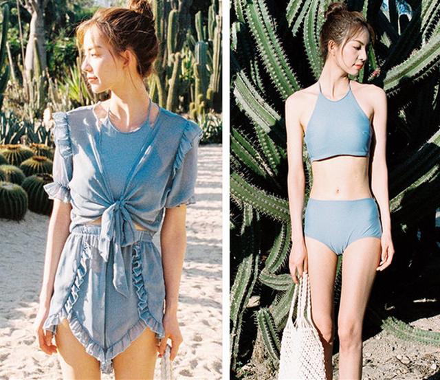 如果你是平时穿着比较保守的女生,那么我建议你可以入手这款特色款四件套泳衣。色系是今年最火的雾霾蓝,显白又清新,特别适合年轻女孩穿着。在泡温泉的时候或者在海滩在玩耍的时候还是避免不了要晒太阳的,这款泳衣搭配同色系雪纺开衫,能够遮阳防晒,还带着少女感。搭配的阔腿花边雪纺短裤,能够遮住你有点肉肉的大腿,在海滩边的公园喝茶也无妨~