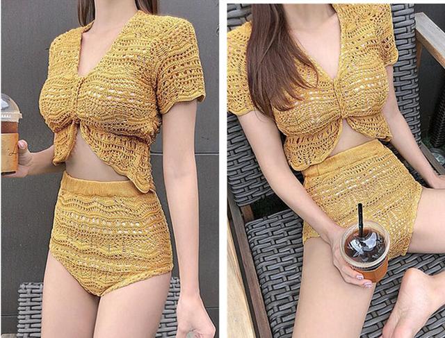游泳的时候要求穿着泳衣的面料比较贴身舒适,但是泡温泉就不需要太贴身的泳衣,这款亮黄色的针织分体泳衣就采用镂空的针织面料,穿着舒适,时尚感超强。白皮的妹子穿上能白的发亮。上半身花边短袖的款式遮肉显瘦,露出你最瘦的腰部位置,也算是一个小心机了。下半身搭配高腰三角的针织底裤,不再紧贴于身,就算你是梨形身材的妹子也不用担心太过贴身造成尴尬。