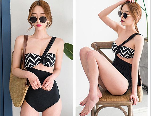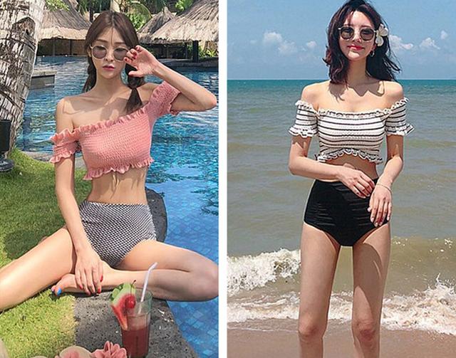 泡温泉的时候我建议还是选择分体式的泳衣,穿脱会更加方便。这款分体式的两件套我个人也超爱,风格偏少女超级好看。有两种色系可以选择,不管不是粉色一字肩搭配黑白格纹底裤还是条纹一字肩搭配黑色三角底裤,都透露出浓浓的少女感。如果你四肢修长,腰部没有赘肉,又是青春活力的小公主的话选择这款泳衣绝会让你在泡温泉的时候收获众多瞩目。