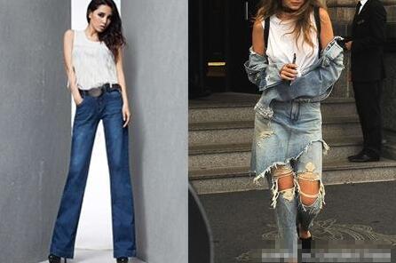 牛仔裤也可以穿得很有时尚街拍范,这时候就需要选择一些有设计感的牛仔裤。左图中的高腰阔腿牛仔裤就是很流行的款式,搭配紧身的背心可以把女性的身材塑造的很性感,再穿一双高跟鞋就让女性变得很高挑,十分有魅力。