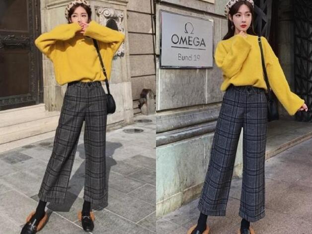 格子元素从来都是流行元素,所以把它与阔腿裤结合显得是很与众不同很时尚,这款黑格的阔腿裤高腰设计,拉长腿部比例,显高显瘦,九分的设计更是效果翻倍,配一双黑色的毛毛鞋是完全没有难度的,也是休闲时尚的一款穿搭!