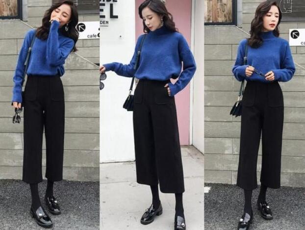 很多人都喜欢穿黑色的裤子,除了它百搭还显瘦显高,而阔腿裤呢,还是很多人选择的黑色而且是纯黑色,这样的阔腿裤优雅大方,显高显瘦,搭配一双黑色的乐福鞋,黑配黑,显瘦效果最佳,如果怕冷,内穿一条黑色打底裤,这样的穿搭高级又时尚!