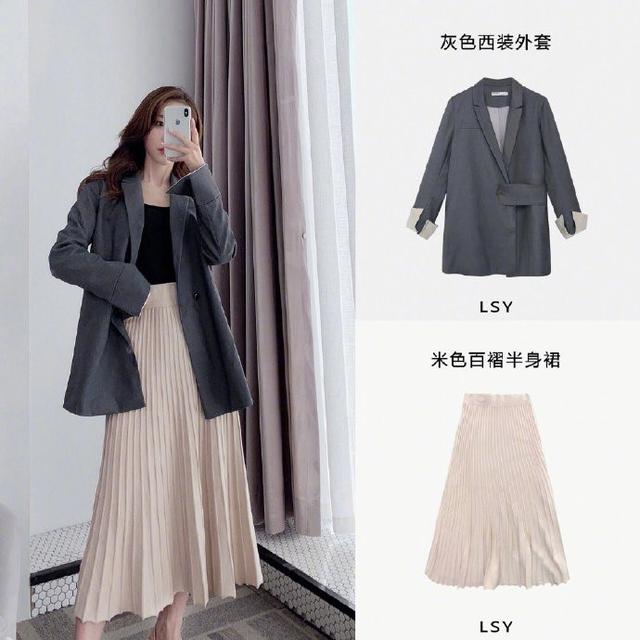 单独的半身裙也是很不错的选择,这次的小姐姐就选择了一件米黄色的半身裙,上面设计了褶皱的元素,让造型可以更可爱不少,上面则是搭配了一件黑色的打底衫,让造型的层次更鲜明不少,外面则是搭配了一件灰色的西装外套,西装外套虽然是稍微长一些的款式,不过里面的高腰裙子的造型,还是可以让整个人都更显高不少。
