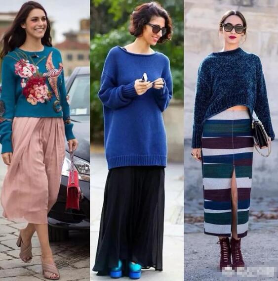 蓝色毛衣+半身裙:浅蓝、天蓝色浅清新,可与多种颜色搭配。蓝色修身毛衣+墨绿色百褶裙,是比较新颖的色彩搭配,绿色在色相环上是相距较远的邻近色,视觉上会有些和谐的感觉。在鞋子的选择上,我个人比较喜欢尖头短靴,整体的搭配更显简约气质。
