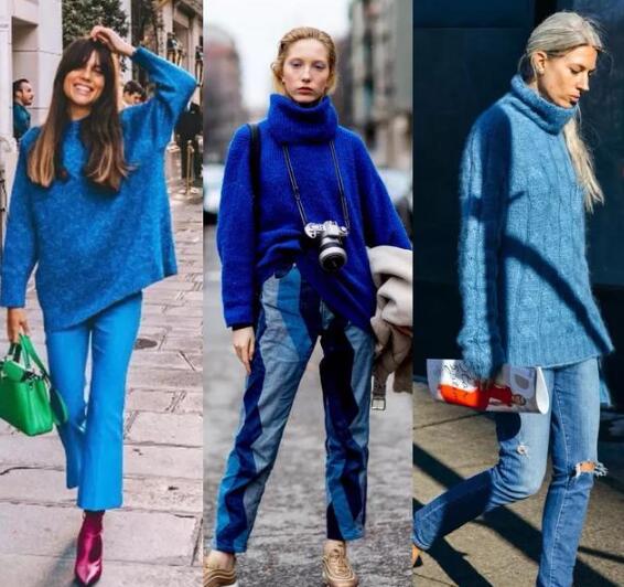 宝蓝色与牛仔蓝色同色系的搭配,会营造出很平静的氛围。用蓝色毛衣搭配蓝色牛仔裤,还会有一种复古感。第一套搭配,一双紫红色的尖头靴子更让整体搭配显得突出,fashion。