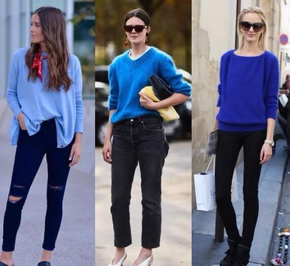 黑色是万能色,所以无论是蓝色系中的哪种蓝色都可以与之搭配。蓝色毛衣+黑色牛仔裤,很简单的日常搭配,用耳饰、丝巾做配饰,会让搭配显得更精致些。想要休闲的感觉,就搭配运动休闲的鞋子,想要更显气质一些,蓝色毛衣怎么搭配裤子和裙子就选择浅口单鞋或高跟鞋,风格是完全不同的。