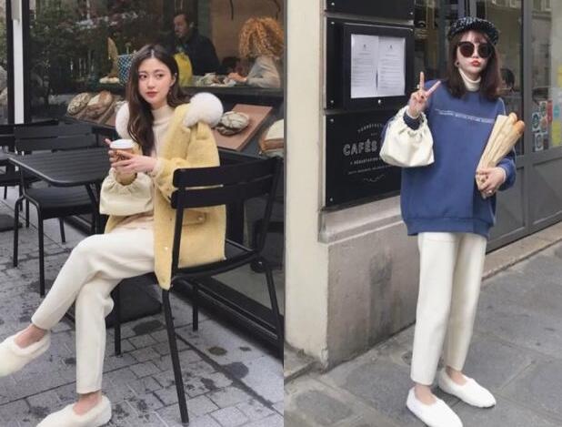还记得我们都很喜欢的奶奶裤吗?其实就是一款很舒适的休闲裤版型,同样是米白色尽显高级感的同时还很修饰腿型的,而且九分的设计让你的腿部线条更加的好看,搭配毛毛平底鞋,让人一眼看起来就很像小女生的感觉,穿上实在是太好看了。