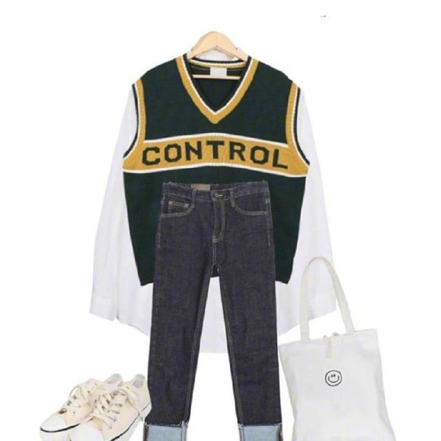 白色衬衫是很具简单大方感的衣服,外搭针织马甲无疑增加了时尚感,也不会使造型很具单调感,马甲有些像运动衣,便能增加女生的青春气息,也不失高级感,很适合在早春这种具有活力感的时期选择,搭配帆布鞋亦是满满少女活力感,清新大方。上身为宽松的衬衫,下身搭配修身牛仔裤便能使女生的腿部更具纤瘦感,但不适合腿型不好看的女生选择。