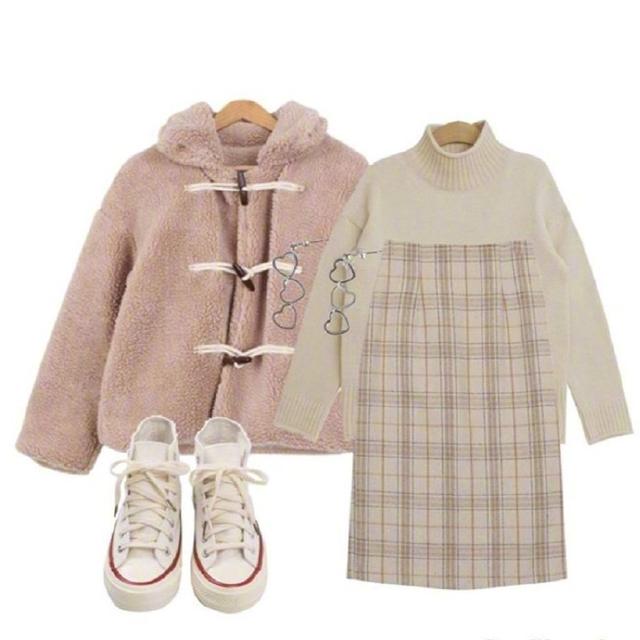 如果你想要更具温婉可人的穿搭,便可以选择这套格子半身裙搭配帆布鞋的穿搭,半身裙本就很具温柔少女感,再搭配帆布鞋不失青春活力感。毛衣以及羊毛衫的搭配亦是温婉感十足,特别是粉色羊毛衫的选择,很具少女感,短款的羊毛衫也能将腿部完全展现出来,在半身裙的修饰下腿部亦能更显修长,这种搭配亦很具时尚感。这身搭配很适合个子小巧的女生选择。