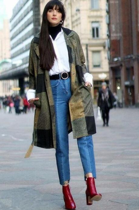 打造当下chic范,当拼色大衣,遇上黑色小高领,散发高雅气息,尽显优雅女人味,美得很出众!将黑色小高领,塞进高腰牛仔裤里,不仅打造出高腰线,更添一丝复古气息。牛仔裤裤脚的不规则裁剪,设计感爆棚!脚上踩着红色短靴,吸睛无数,秀出高挑身材!