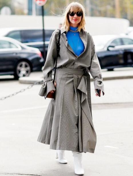 自带高级感的灰色,怎么搭都不会出错。选择灰色大衣+蓝色小高领,尽显女人妖娆抚媚的气质,散发高雅气息!灰色大衣下摆有这褶皱设计,时髦度依旧不减,美得很出众!脚上搭配白色短靴,知性中带有一丝小清新,打造率性淑女范!
