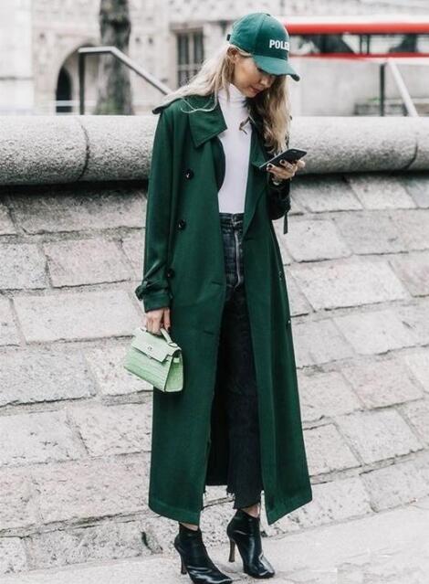 打造当下chic范,选择墨绿色大衣+白色小高领,一袭优雅感扑面而来,潇洒中带有一丝自然气息,很是撩人!将白色小高领,扎进灰色牛仔裤里,提高腰线同时更加帅气。脚上搭配黑色短靴,精简又有格调。墨绿色的棒球帽,与墨绿色大衣相呼应,让你在人群中脱颖而出,元气满满!