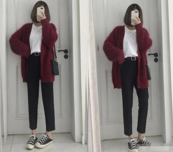 首先要介绍的是开衫,这件针织单品的气质是非常温柔的,保暖性也不错,时尚实用又好搭,随便搭配都是女人味十足的温柔气质,搭配烟管裤,半裙,搭配屋,都OK,颜色建议选择米色、灰色、卡其、咖啡色、暗红色等。