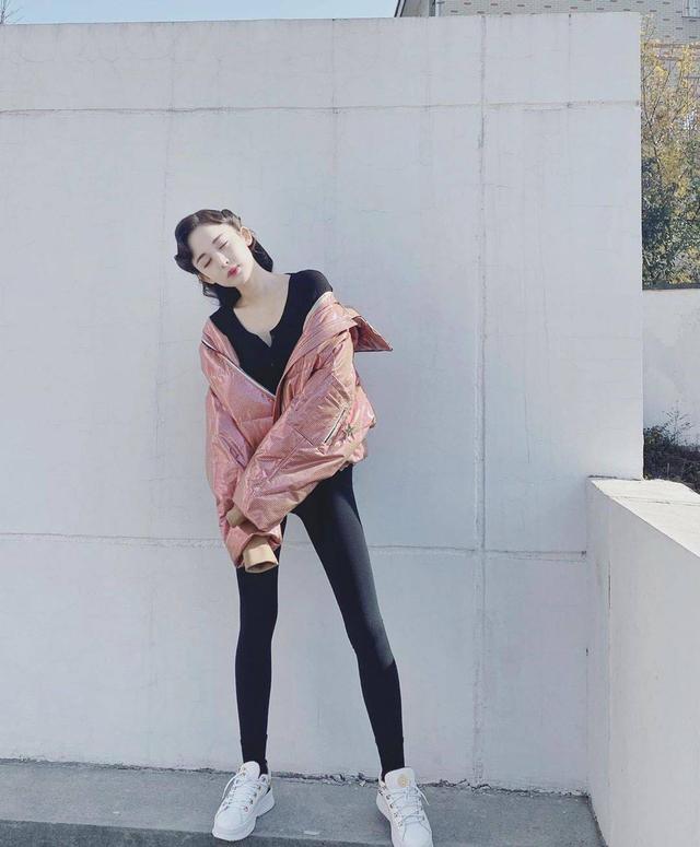 裤子是最为简单的黑色紧身裤,将完美的大长腿优势显现无疑。脚上搭配了一双百搭的休闲鞋,外面还披了一件粉色宽松外套,整体给人的感觉元气满满。发型部分是稍复古的风格,不仅与整体的穿搭显得一点都不冲突,还增加了这身运动风穿搭中不一样的复古美。