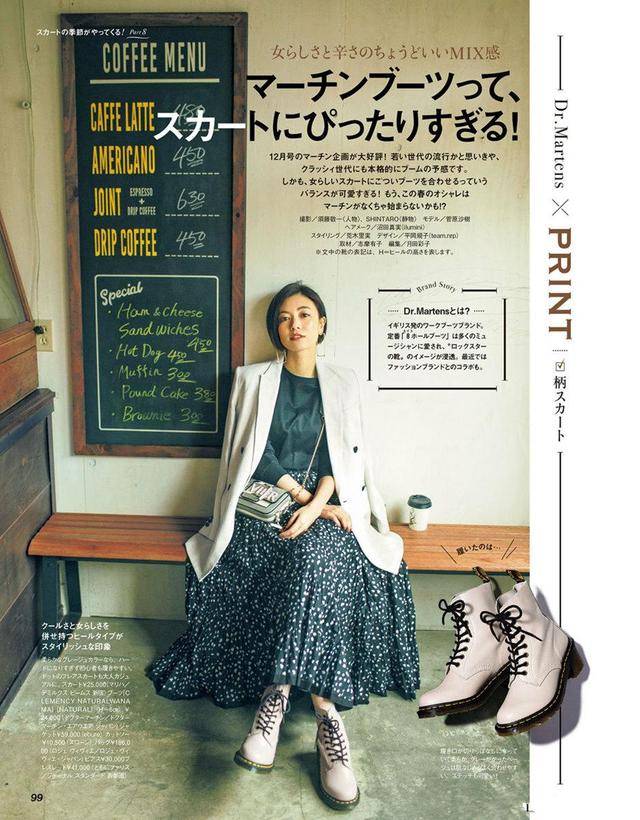帅气已经不再是男生的代名词,当漂亮的仙女穿上一款简洁的工装风时,满眼都是时髦和帅气。图中小姐姐身穿驼色的工装外套,简洁的风格具有流畅的线条感,内搭一款黑白搭配的T恤自然又大方。下装搭配一条正红的半身裙,鲜艳又醒目,柔软的材质飘逸的裙摆无不展示出十足的女人味。然而,即使裙装多么的千娇百媚,简洁的工装上衣都能完美地中和过渡,脚上搭配一双黑色的马丁靴,配合头顶活泼的报童帽,轻松赚足回头率。