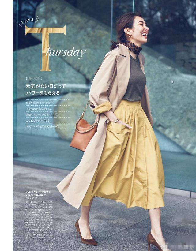 想要气场足够强大,百搭的风衣是你凹造型的不二法宝。一直以来风衣凭借潇洒的外形,超强的包容力受到男女老少的喜爱。卡其色的风衣搭配亮黄色的伞裙,仿佛是清风拂面般的自由舒畅,周围的一切都成了她的陪衬,自由的灵魂尽情的绽放,没有一丝一毫的矫揉造作。双手插兜的洒脱足够引人注目,豪爽的笑容让人觉得生活充满了希望。