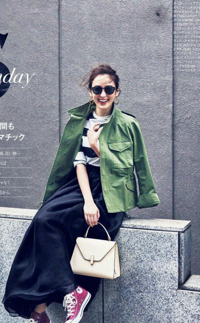 绿色工装又潮又酷,还能给人一种青草般的清爽味道。如果喜欢干练洒脱的气质,可以搭配一款减龄时髦的牛仔裤,若是腿型修长笔直,紧身的款式会更加适合你。图中的小姐姐选择一款深蓝色的长裙搭配帅气的外套,高腰的款式营造出上短下长的显高穿衣模式,宽松的长裙由两层同色但不同质地的布料组成,可以形成丰富的层次感,及脚踝的长度可以隐藏各种不好看的的腿型,脚踩粉色匡威高帮鞋时髦又亮眼。