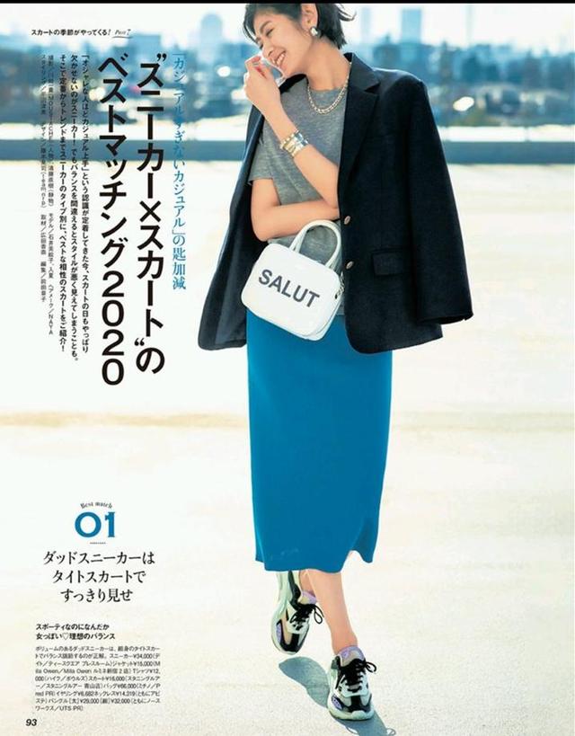 混搭的风格往往会给人带来一种出其不意的时髦效果。黑色的西装给人一种正式的感觉,蓝色的长款包臀裙醒目又有女人味,黑灰相间的运动鞋休闲放松又具动感的气息。看似不同气质的单品,当它们组合在一起,瞬间打造出生动、时髦又不乏女人味的时尚品味,而且减龄的效果也是非常的明显,结合她自信的笑容,真是迷人不偿命。
