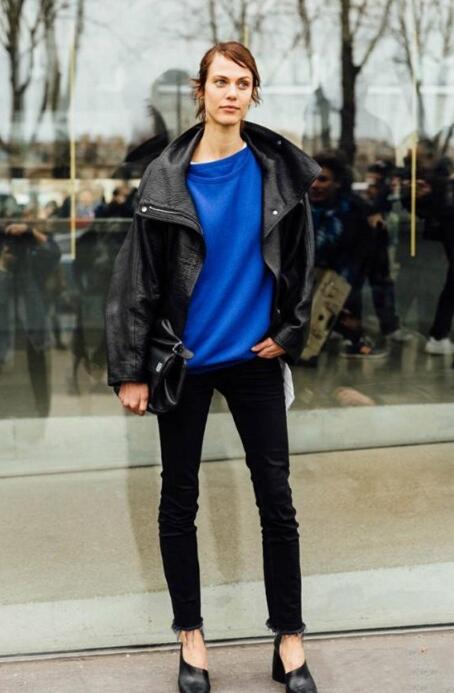 皮衣除了能配裙子,搭上裤子也是极好看的。黑色的皮衣里面内搭深蓝色单品,下半身无论是搭配裙子or裤子,都格外显气质。而这身搭配,小仙女更喜欢pick黑色的裤子,显瘦又显高挑。脚上穿的是黑色的鞋子,和裤子、皮衣同样是黑色的,非常简约。