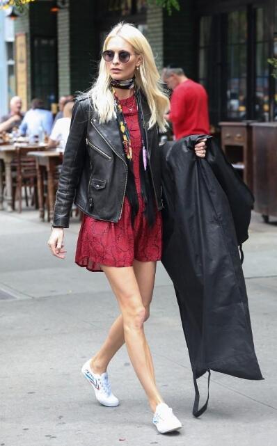 当黑色的皮衣遇见红色的裙子,极具时尚感。这款蕾丝裙子,淋漓尽致地展现了小仙女的甜美感。脚踩小白鞋,彰显着满满的少女活力,给你不一样的魅力。这时候系上丝巾,显得更加有女人味了,整体look,又酷又甜美,走在街上可以赚足回头率呢。