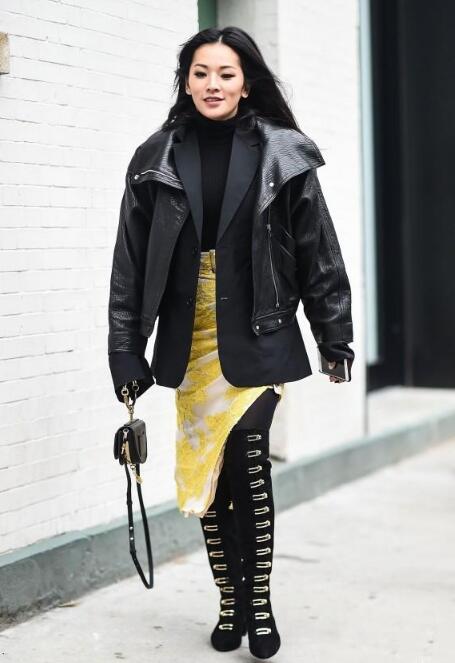 黑色皮衣配上黄色裙子,所产生的亮度,非常抢眼。采用叠穿的方式,在皮衣里面搭上黑色西装,非常有层次感,给你不一样的魅力。脚上pick的是黑色的长靴,凸显了小仙女纤细的小腿,整个人看起来非常优雅高挑。手提黑色的小包包,更加彰显了优雅感。