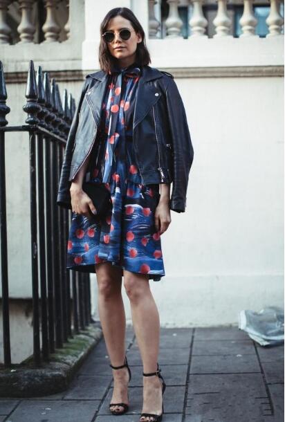 秋冬出行必备黑色皮衣,不管是搭配裙子or裤子,都能散发着满满的酷感。在这身搭配中,小仙女选择的是印花裙,显得特别有活力。在皮衣的帅中加入甜美的裙子,彰显着独特的风格。脚踩黑色的高跟鞋,使小仙女看过去更加高挑。pick黑色内搭墨镜更是增加了不少酷感。