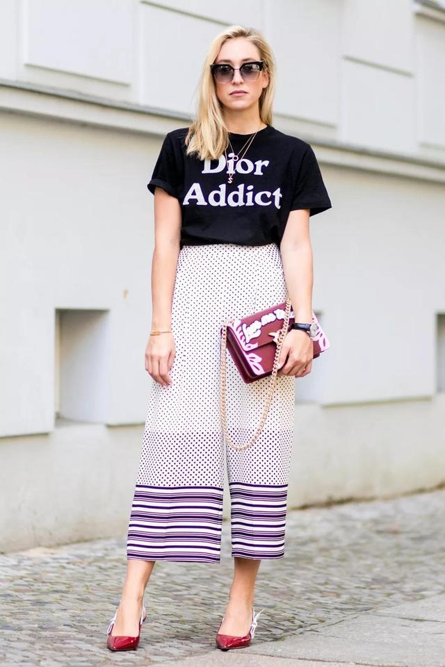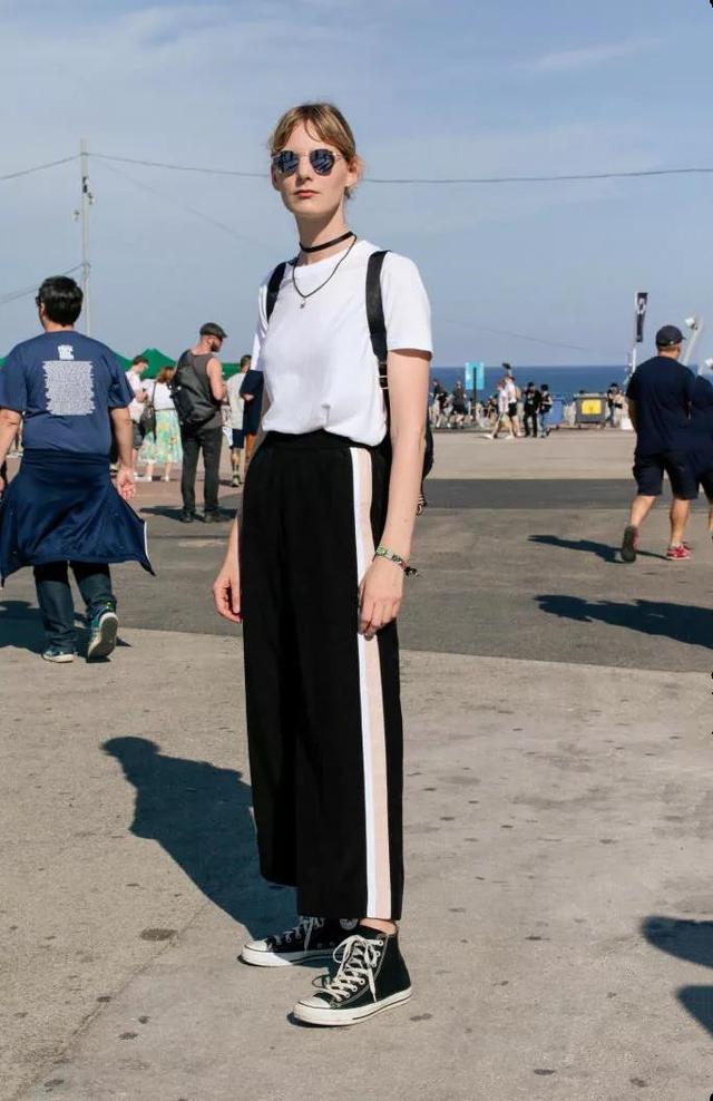 具体来说,就是我们在搭配时要遵循松紧结合的原则,由于宽裤子的款式过于阔大,因此在选择T恤时尽量以修身为主,若同时选择宽松的单品不但不会修饰身形曲线,也很容易显得没有气质,而这种上紧下松的组合给人的感觉会格外舒服;当然,要想尝试宽松的组合,那么建议你选择今年很火的crop top上衣,既能提高腰线展示身材,又极具时尚感。