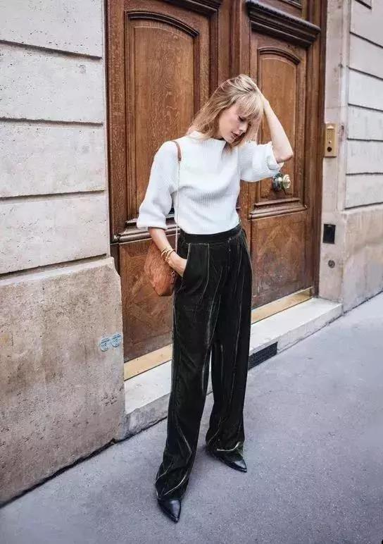 除牛仔之外,像西装、缎面、丝绒之类的面料就很轻盈,触感光滑而且线条柔和的版型对腿型的修饰效果极其显著,而且这些面料的垂感极好,亲肤柔软的特性穿上身舒适又自在,在搭配上这种材质的宽裤子格调也很高。