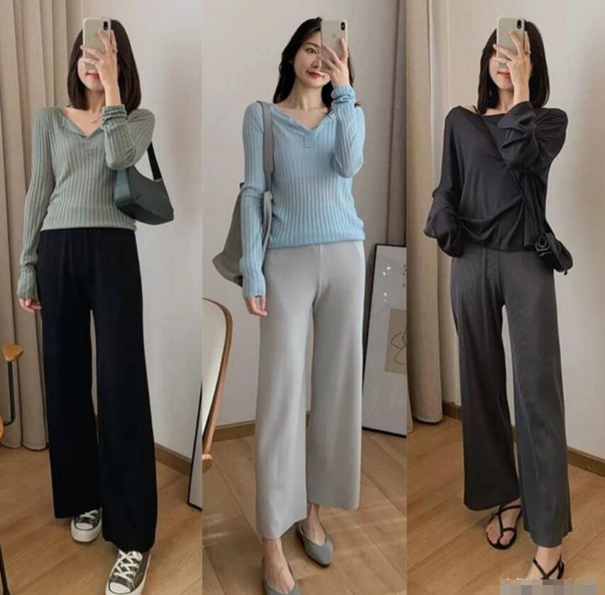针织质地的上衣一直以来都是我特别喜欢的单品,因为它总是能够给人带来一种很温柔很知性的感觉,选择薄款针织衫搭配丝绒裤能够彰显出女人味,穿出很知性温柔的感觉。选择一件灰色的针织衫搭配一条黑色丝绒裤,穿出气质知性的感觉。蓝色的薄款针织衫给人一种特别清新的感觉,搭配上浅灰色丝绒裤,再搭配一双蓝色单鞋,整套搭配很顺色,显得特别的协调,穿出清新又温柔的感觉。