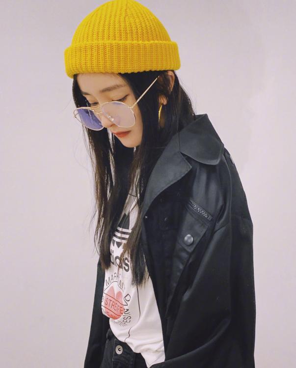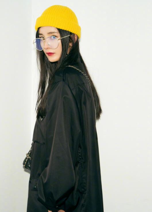 在第1张照片中,杨幂给自己的上半身来了一个特写,我们可以看到她那顶小黄帽在整体的视觉里面让人觉得非常的亮眼,你第一眼看上去肯定是杨幂头上戴的那顶黄色的帽子。毕竟这顶帽子的颜色太艳丽了,所以会在视觉感上产生非常强烈的冲击。除了帽子以外,杨幂还带了一副非常大的金丝眼镜,杨幂的脸本来就非常小,在这副眼镜的衬托下显得更小了,眼镜的镜片都差不多能有她半张脸那么大,在这样的对比下,大家也很容易看出来杨幂的巴掌脸到底有多小。