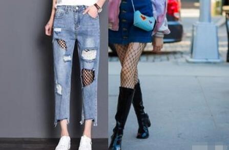 通常,网袜都是搭配的破洞牛仔裤,如上图两款都是。尤其是图左这款,膝盖与大腿位置的大块破洞九分牛仔裤,搭配全身网袜,以及黑色平底短靴。再比如图右这款,简单破洞微喇叭八分牛仔裤,搭配高跟长靴。