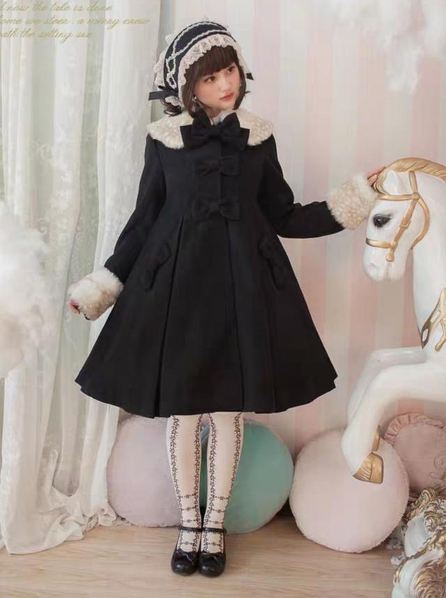 虽然斗篷的保暖能力还是挺不错的,但是毕竟是没有袖子,没有纽扣的,所以难免会有一些漏风。所以如果是温度再低一些的话我们可以穿一件小外套。因为小裙子风格的原因,普通的外套搭配上洛丽塔的小裙子可能会有一些违和感,这个时候我们可以选择一件甜甜的小外套。