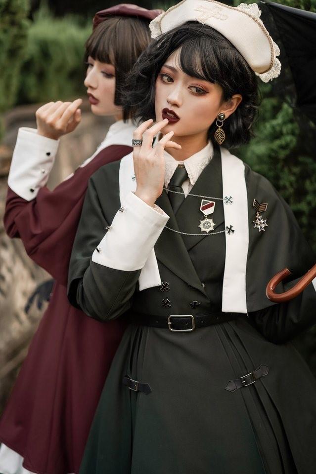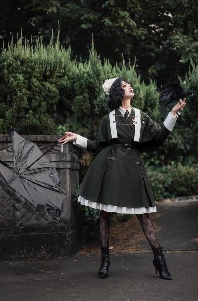这一件裙子就非常戳Seven的心,这一条裙子不像普通的洛丽塔小裙子一样比较甜腻,这一条裙子整体的风格偏哥特风,也就是偏暗黑风格。这一套裙子包括一条OP,也就是一件长袖连衣裙,一件小斗篷和一件衬衫,看起来非常干净利落。穿上这一套衣服之后,你就是这条街上最帅的小姐姐。