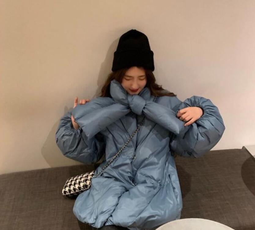 这冬天可以适当地减少购买黑色的冬季外套,选择其他更为新奇的颜色,像这件低饱和度的蓝色就是最近几年非常流行的颜色了。因为相较于其他明亮的颜色而言,它的色泽比较低调,但因为材质的原因又能够散发出淡淡的光泽感,让人觉得这件衣服的质感很好。此外,它还有一种独特的设计,就在于领口处可以像围巾一样系起来,增加了保暖的效果。这件外套的版型特别宽松,很适合藏肉哦!