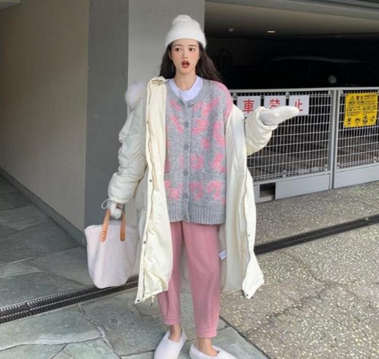 冬天应该要在衣柜里备上一件长款的白色外套。很多年长的女性不喜欢白色,因为白色最不耐脏,但是年轻的女性就会把白色外套当成必备款。而这件长款的白色外套,可以穿出青春靓丽的感觉,内搭一件灰色的针织衫,下半身选择一条活泼的粉色“奶奶裤”就可以体现少女的粉嫩。