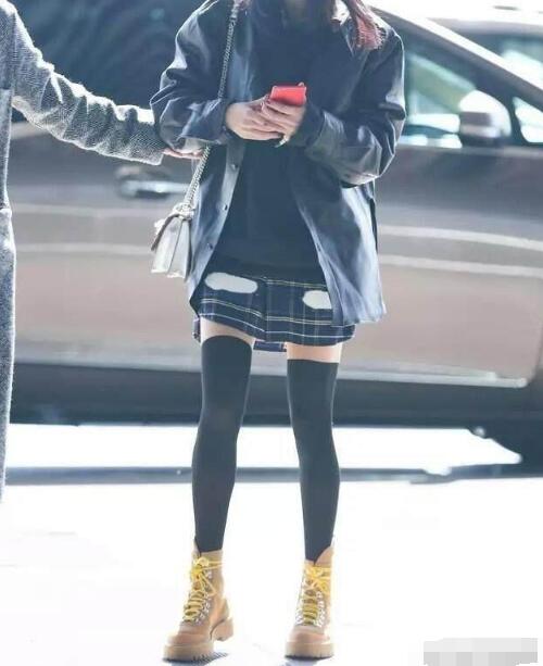 大幂幂果然是腿长任性,黄色的马丁靴本来已经很难驾驭,还搭了一双色彩完全分层的黑色过膝袜,和上身穿的短裙之间留出大腿的一小块“绝对领域”,有种若隐若现的性感不说,还颇有一种日本少女的二次元风,你有没有get到呢?要是你也想穿成同款,小编建议你把马丁靴换成黑色的,和长袜颜色一致,又显瘦又显腿长。
