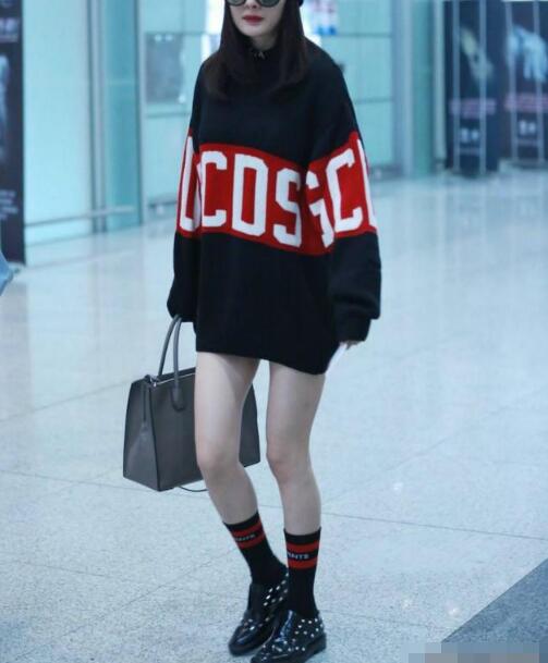 杨幂果然是Oversize卫衣的忠实爱好者,这边又穿了一件黑色卫衣,上面的红底字母印花潮范儿十足,要是单穿一双浅口小皮鞋露出两条白花花的大腿,在秋天未免太凉快了一些,她选择一双红色条纹白色字母的黑底长袜来搭,不仅跟上衣颜色搭调,还同时把保暖和凹造型做到位了。