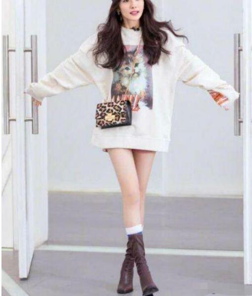 露袜边的潮流,杨幂连短靴都不放过!这双枣红色的短靴相比于上面那双更不挑身材得多,修身的线条和不过膝的长度让双腿更加完美,和“下衣失踪”风的Oversize卫衣搭起来真是绝配,露出一小圈的白色袜边瞬间凸显层次感,一下子削弱了靴子颜色的老气,露袜边后简直不要太洋气。