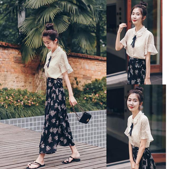 第四套:超美的两件套,温柔的杏色雪纺衫,夏天穿上让你美到底,小巧甜美的娃娃领+蝴蝶结的组合,轻松打造出造型感,五分袖型,遮肉显瘦,袖口拼接荷叶边,层次感满分的哦,下身的印花半身裙,高腰包臀的设计,完美的身材立显,还超显瘦的。夏季套装女装两件套图片
