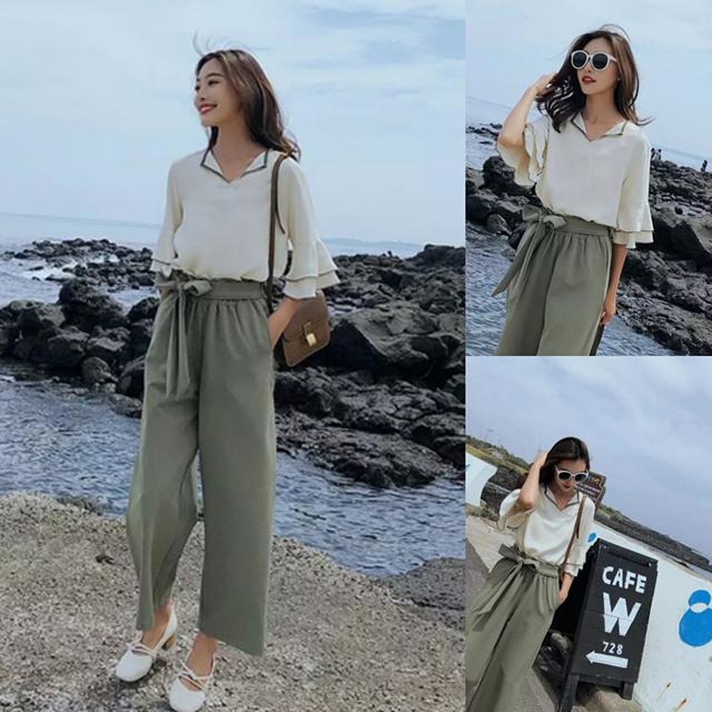 第三套:个性潮流的一套两件套衣服,时尚的休闲套装,上身舒适又好看,上身是一件V领设计的雪纺衫,修身又好看,下身花苞阔腿裤,凸显身材,满满的青春风范,谁穿谁美。