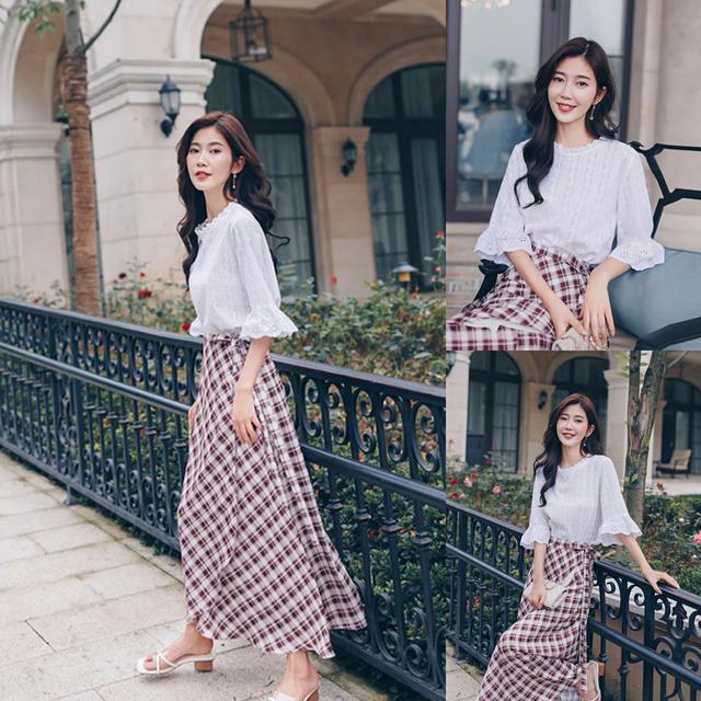 第二套:小清新感的一款雪纺衫,轻薄的质地,再加上纯白色,飘逸又仙气,关键的是很女人,可爱又文艺的木耳领,修饰颈脖线条又美丽,下身选择一条格子半身裙来进行搭配,简约又复古优雅,这可是超美的两件套套装,怎么穿都美。