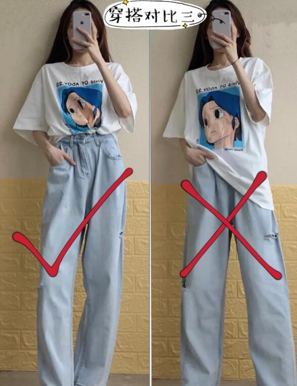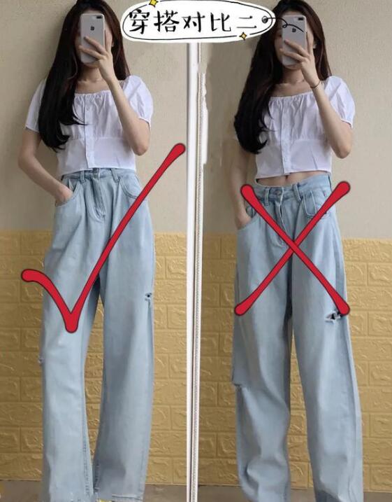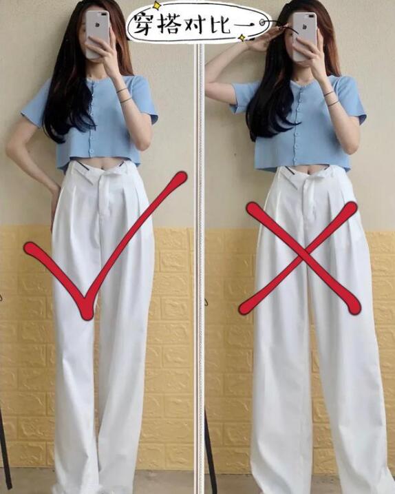 阔腿裤这件时尚单品,这两年的火爆流行程度是只增不减。包括很多明星街拍和时尚达人对它爱不释手,特别能藏肉肉还显瘦。那么我们在挑选款式的时候一定要记得挑选高腰的阔腿裤,不要挑选低腰阔腿裤。比如以下穿搭对比,同样款式的上衣搭配,左图穿搭下半身选择了一条高腰阔腿裤,而右图穿搭下半身选择了一条低腰阔腿裤,很明显左图的搭配更显大长腿,从视觉上更显高显瘦。