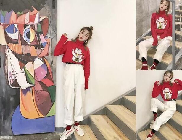 红色就是新年专属的颜色,它代表喜庆,好运气,旺财等等的好寓意,所以很多人都会在新年穿上红色的单品,这件是新年必穿的红色毛衣,带有招财猫的图案,更加惹人爱,寓意你新的一面挣钱盘满钵满,颜色也是很吸睛的色调,搭配白色的高腰阔腿裤,红和白的颜色组合,造型瞬间就提亮起来,好时髦!