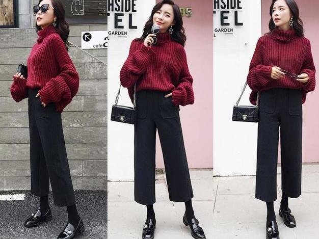 对于喜欢比较极简约风,不想要有图案的红色毛衣的女生来说,这款高领款毛衣就很适合,没有图案很低调,却突显出它的时髦感,搭配九分的黑色阔腿裤,是自带显瘦效果的裤子,红色毛衣怎么搭配阔腿裤?觉得自己下半身比较胖的女生,春天就应该这样穿,显瘦又好看。