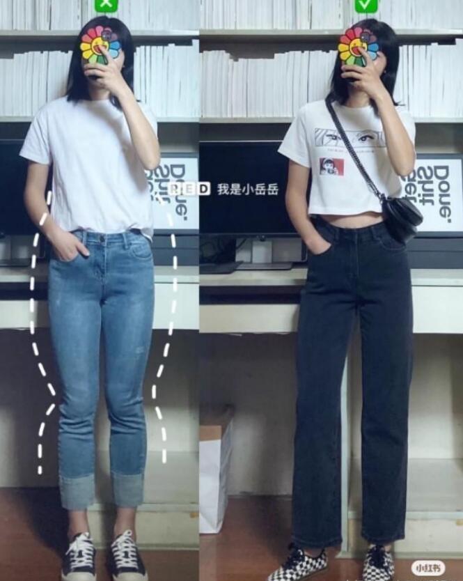 比如上面这张对比图,腿部条件不好的妹子们穿这种紧身牛仔裤简直就是灾难现场。右边选择的直筒裤就可以很好的修饰腿型,明明是同一个人,感觉完全不一样,所以大家应该明白自己要挑选什么样的裤子是合适的,不能相信紧身裤会显瘦,实际上不但不显瘦还显胖。