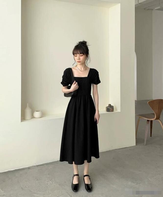 既然讲到了裙子可以帮助我们修饰身材缺陷,所以就必须给大家推荐一条每个人都可以穿的小黑裙。话说每个女生都应该拥有一件小黑裙作为自己的战衣,可以帮助我们出入各种场合。今天选择的这件小黑裙也是比较好看复古的法式大方领设计,这种设计多显瘦好看应该不用我多说了。这件裙子袖子部分抽褶的设计也是亮点,很多女生都有“拜拜肉”,而这种设计恰好可以遮住手臂肉最多地方,实力显瘦。连衣裙的重点也是突出腰身,这样整体比较平衡也比较显身材,不过这种版型的裙子包容性都很强,基本不挑身材,上身都很优雅。推荐大家穿裙子的原因其实就是因为裙子实力遮肉,露出来的都是比较纤细的地方,有缺陷的地方都遮住。脚踩一双流行的复古单鞋,法式复古风立马就有了,优雅知性又温柔。